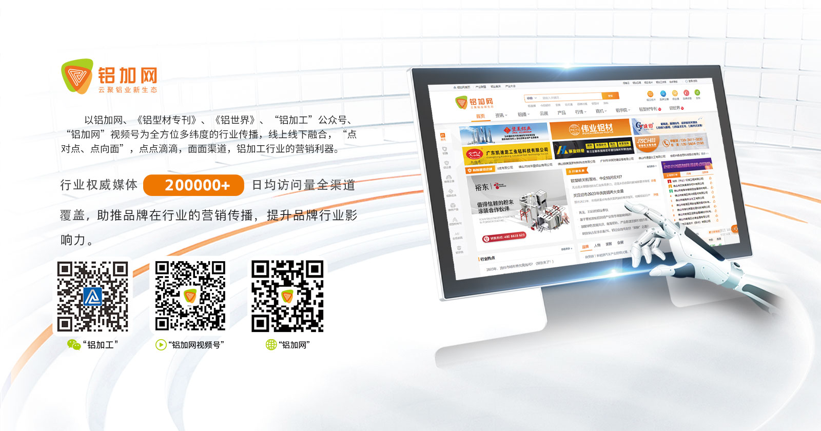 鋁加網(wǎng)(www.albiz.cn)是聞名鋁加工行業(yè)的垂直門戶網(wǎng)站,云聚鋁業(yè)新生態(tài),構(gòu)建鋁業(yè)新場(chǎng)景,以albiz.cn 網(wǎng)站為核心,以移動(dòng)云端、鋁加工微信、鋁加網(wǎng)視頻號(hào)、《鋁型材??泛汀朵X世界》雜志為載體,成為了鋁加工行業(yè)資訊和精準(zhǔn)傳播的首選傳媒。鋁加網(wǎng),采集和發(fā)布全行業(yè)信息資訊,提供線上展覽、在線直播、短視頻、品牌策劃、品牌運(yùn)營(yíng)、品牌傳播等全方位的專業(yè)服務(wù)。